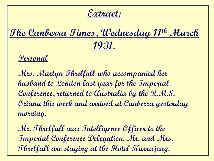 Martyn, nephew of Professor (Sir) Richard Threlfall (14/8/1861-10/7/1932) who founded the first School of Physics at Sydney University. Martyn was grandson of Richard Threlfall of Hollowforth, Preston, Lancs, a wine merchant, small landowner and mayor of Preston 1855/56 (click here).