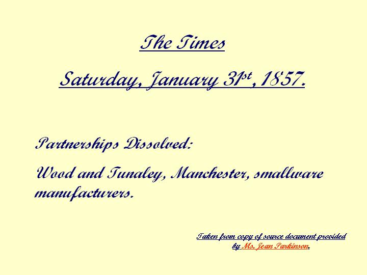 Click here for newspaper announcement of the end, 1857, of John's smallware partnership - document courtesy of Jean Parkinson.