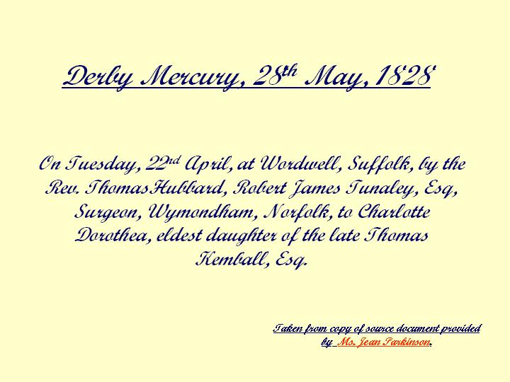 Robert qualified as a surgeon in 1823. Records show that as part of his training he studied at St. Thomas's and Guys Hospitals, London, and spent four years in practical training at what was then Derby General Infirmary. Unlike Charles Tunaley (b. 1808) who went on to become an F.R.C.S., Robert chose instead to enter the practice of Thomas Kemball, surgeon and apothecary of Wymondham and Robert's future father-in-law. |