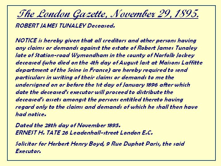 (above date of death confirmed in public notice, London Gazette, November 29th., 1895 - click here). Robert declared to have left effects amounting to £984 17s 7d (info. courtesy of Dr. Jane Holmes).