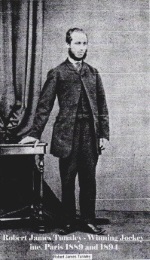 Robert Snr.: winning jockey on Bandmaster in the Prix la Haye Jousselin steeplechase, Paris, 1889.